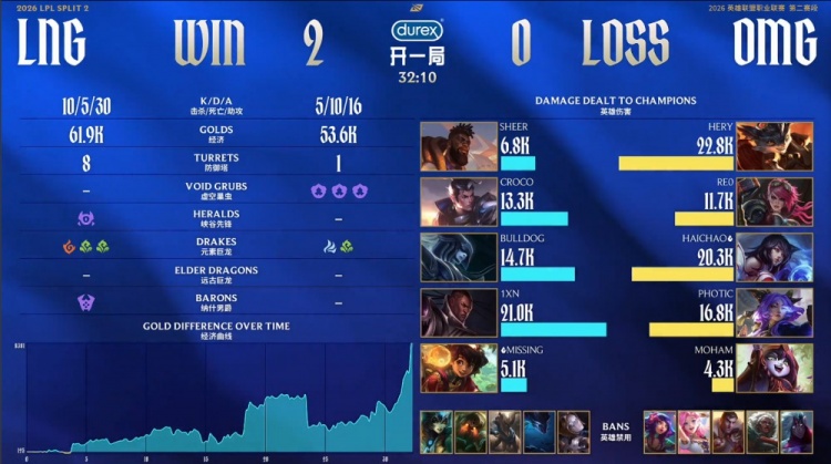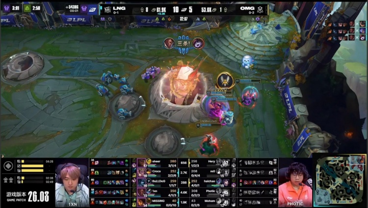 中期下路混战,Croco见面睡着。再到小龙团,sheer奎桑提游龙双杀,LNG打出0换3后推掉OMG中路二塔,经济优势来到4k以上。