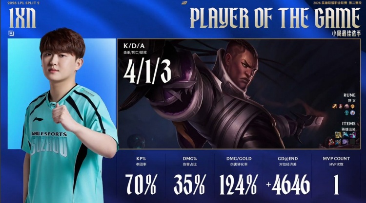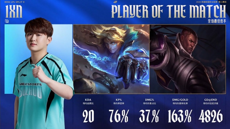 后期中路团战1xn卢锡安见面被秒,sheer奎桑提没能顶住前排,OMG打出1换3。随后LNG拿到大龙上路推进,re0蔚锁头进场被秒,LNG顺势冲上OMG高地,1xn卢锡安三杀收尾,LNG一波推平OMG基地拿到比赛胜利。