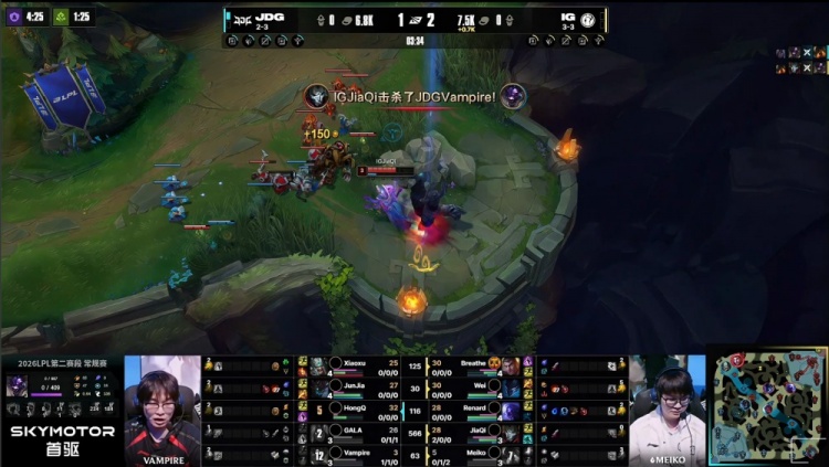 【15:10】先锋团,Meiko泰坦龙坑之上被HongQ永恩隔墙砍掉后二段E飞回逃生,随后HongQ上路再砍Breathe杰斯,Wei梦魇关灯飞上反送Junjia茂凯人头,HongQ残血再击飞Renard瑞兹送Junjia茂凯双杀,JDG打出0换4。
