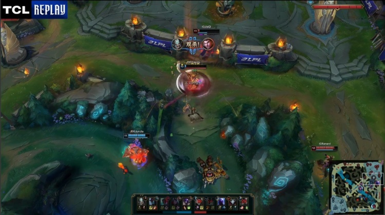 【23:33】野区团战,Renard瑞兹换掉GALA韦鲁斯,HongQ永恩与小徐蛮王砍爆iG,JDG打出1换4,推掉iG中路水晶撤退。