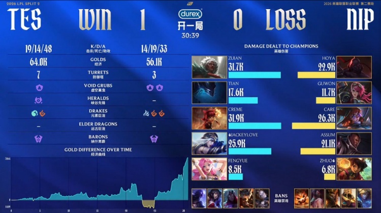 随后Care复活TP下路绕后,Guwon蔚自家野区留人,HOYA赛恩吃掉小天人头,ZUIAN安蓓萨也被留住送Care人头,哥哥三角草被NIP众人集火致死,人头送给复活的Assum,NIP打出0换3,扭头吃掉大龙,小天复活抢龙失败被杀,NIP再打出0换2,中路推掉TES一塔,HOYA赛恩撞空自己被卖,Guwon蔚再杀哥哥,Assum点掉Creme安妮,NIP经济领先1k,双方拉开,NIP听牌火龙魂。