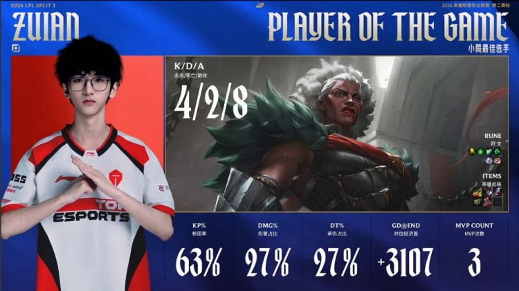 后期团战ZUIAN安蓓萨多次逮捕Assum卢锡安,TES拿下大龙,经济优势回到4K。终极龙魂团ZUIAN叕逮捕Assum,TES瞬间打出1换4,一波推平NIP基地先下一城。