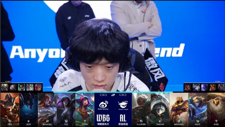 第一局前期Jiejie梦魇入侵AL上野区送Tarzan蝎子一血,随后Tarzan蝎子上路gank配合Flandre安蓓萨击杀Zika兰博,AL取得小优势。