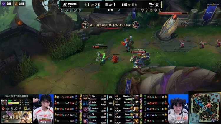【11:39】AL拿到两条小龙,本局为风龙魂,Flandre安蓓萨TP正面,上路Zika吃掉两层塔皮。WBG经济领先1.7k。