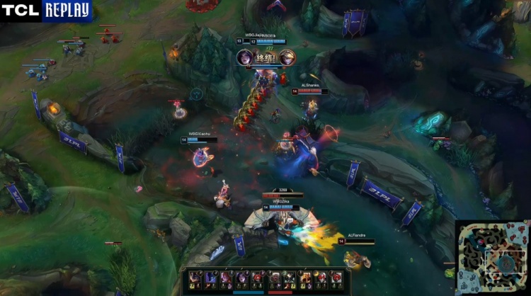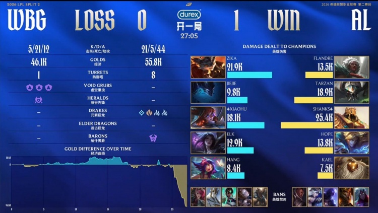 后期AL打出3换4拿到风龙魂,AL中路推进击杀xiaohu后回头拿下大龙,WBG四人接团被团灭,AL连战连捷,冲上WBG高地推平基地先下一城。