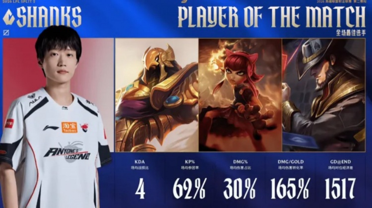 >Shanks三局打出场均1500对位经济差,斩获AL对阵WBG大场MVP
