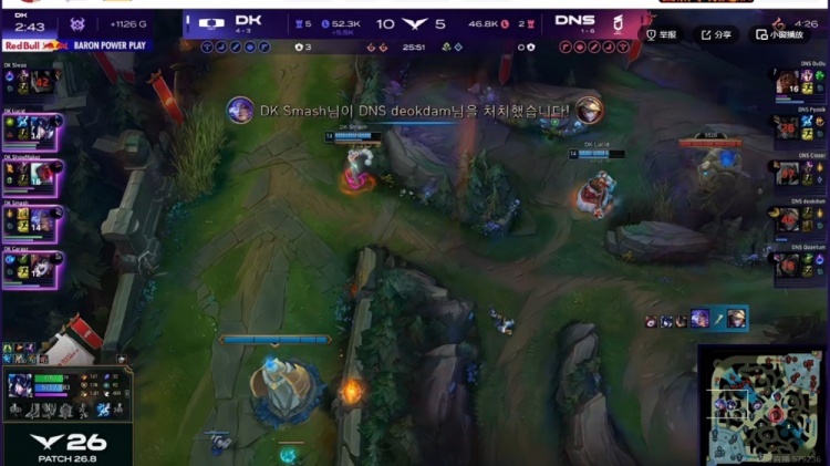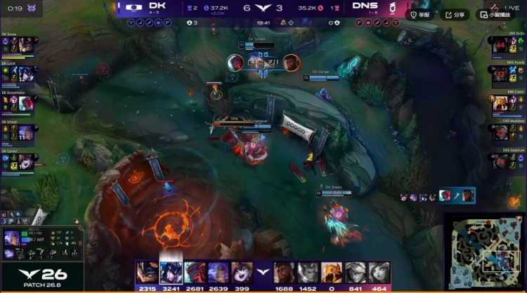 22分钟正面DNS多打少主动开团强杀SMK永恩,Siwoo兰博则是边带掉了二塔,对位领先2000多了!25分钟DK拿下小龙,DNS大龙逼团选择硬打,结果Siwoo兰博一个大招拉满输出,DK逐个击破!拿下大龙打出1换4!扩大经济差到接近7K!