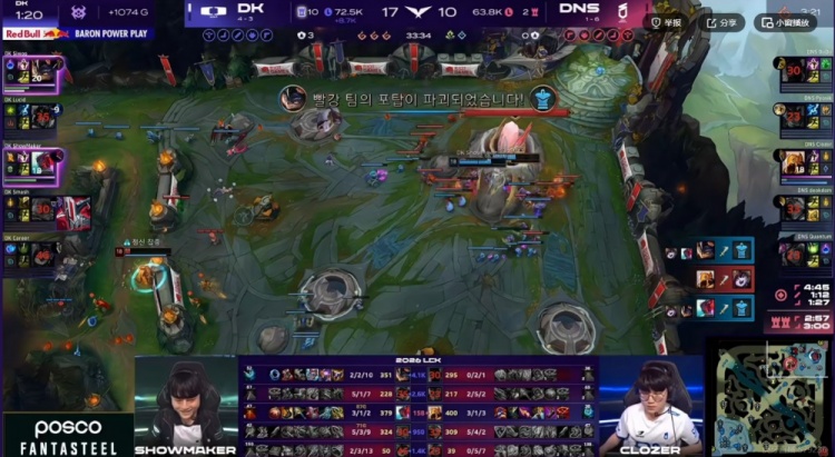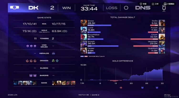 29分钟DK1-3-1分推拆掉DNS中下两路高地!回头小龙刷新,Siwoo兰博大招烧了三个自己进人群1V4白给,不过几乎满状态的Smash芸阿娜面对DNS五个残血毫无压力!双方打出2换2但是DNS必须回城整补!DK顺势拿下听牌龙+二大龙!两队经济差来到9K!33分钟高地团,DNS强开Lucid猪妹但是猪妹没倒自家上野先没了啊!DK打出3换4,拆掉最后一路高地!一波结束比赛!