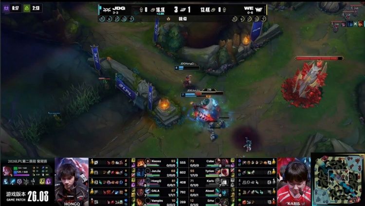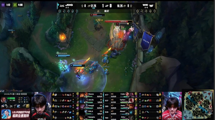 直播吧4月25日讯 2026LPL第二赛段常规赛组内赛继续进行,今日第二场比赛JDG横扫WE!