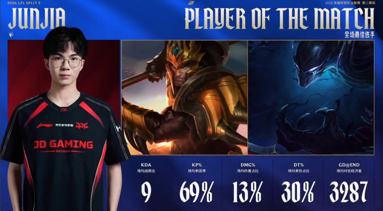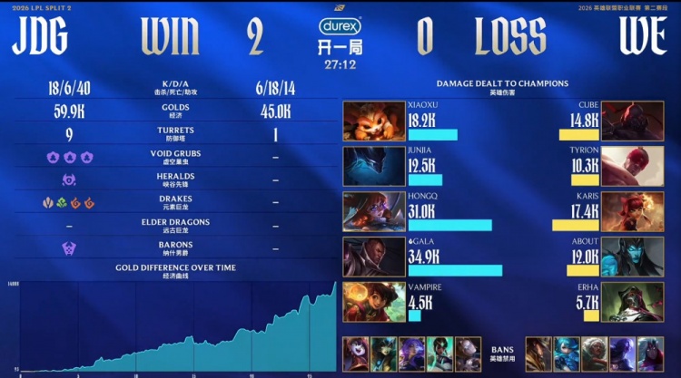 后期比赛早已失去悬念,JDG轻松推平WE基地拿到比赛胜利。