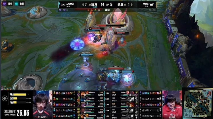 【23:43】JDG中路推进至WE高地前,爆炸果实送双方多人飞天,落地后小徐大纳尔被About卡莉丝塔击杀,但JDG正面依旧打出1换3,GALA卢锡安下路被抓无伤大雅,JDG经济领先1w以上。