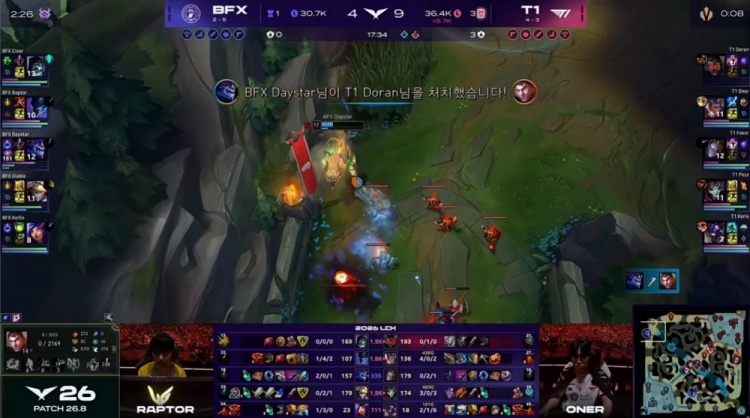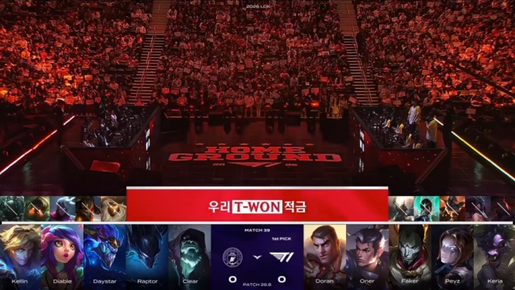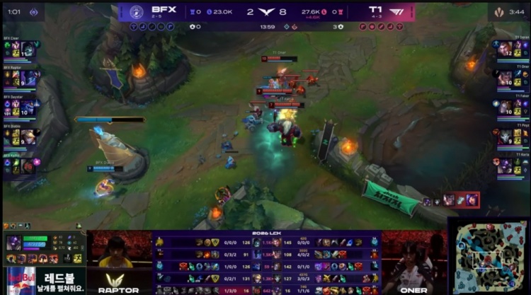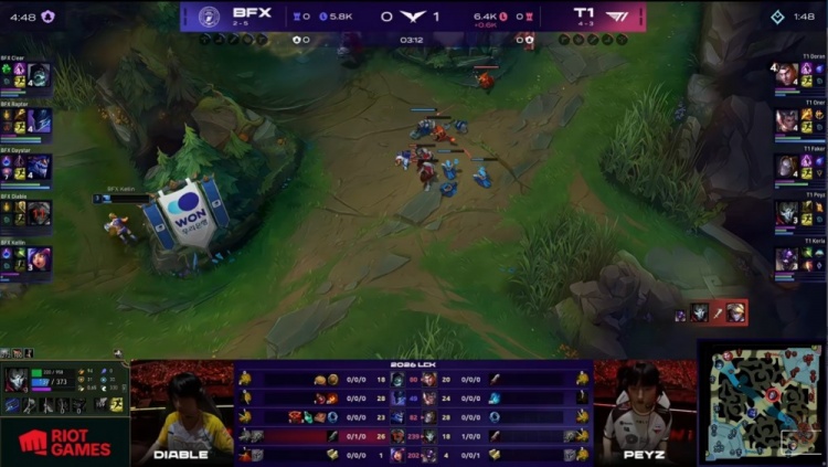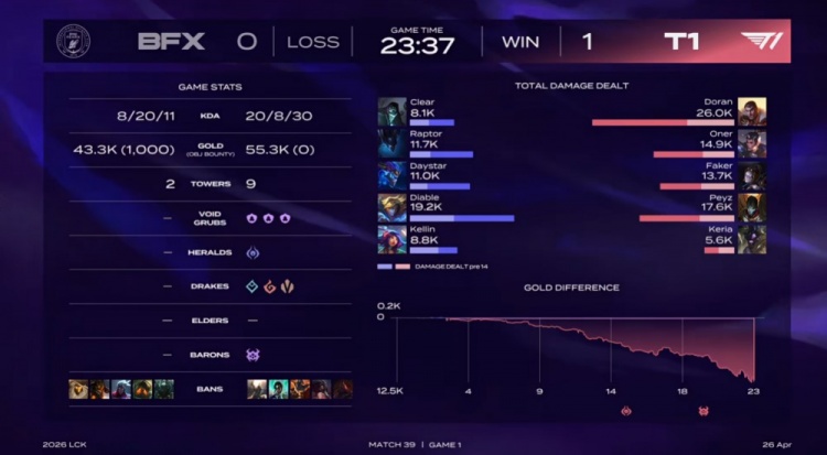 直播吧4月26日讯 2026LCK常规赛继续进行,今日首场比赛由T1对阵BFX!