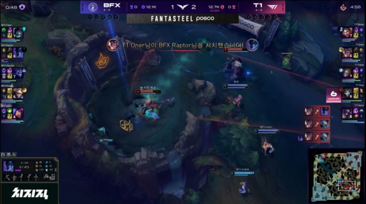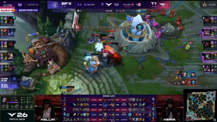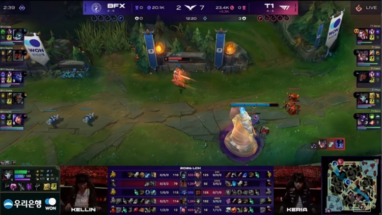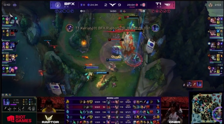 中期Keria牛头多次先手配合Oner赵信击杀Kellin妮蔻与Raptor梦魇,T1将经济提升至5.5k。BFX虽在下路击杀Faker,但T1仍保持约6k经济领先。