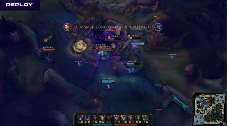 【17:31】多兰杰斯上路三角草埋伏Daystar龙王却遭反杀,BFX下野区Raptor又被T1打野射辅三人组逮捕,Raptor研发i5。