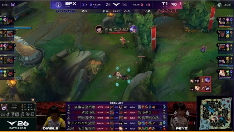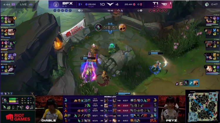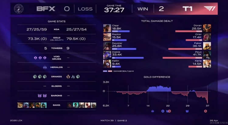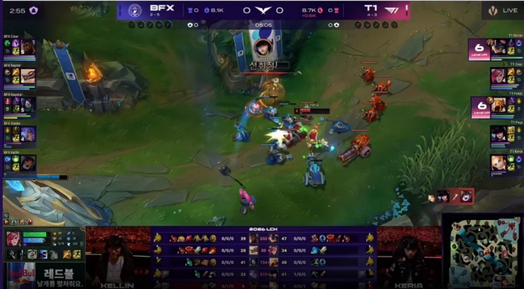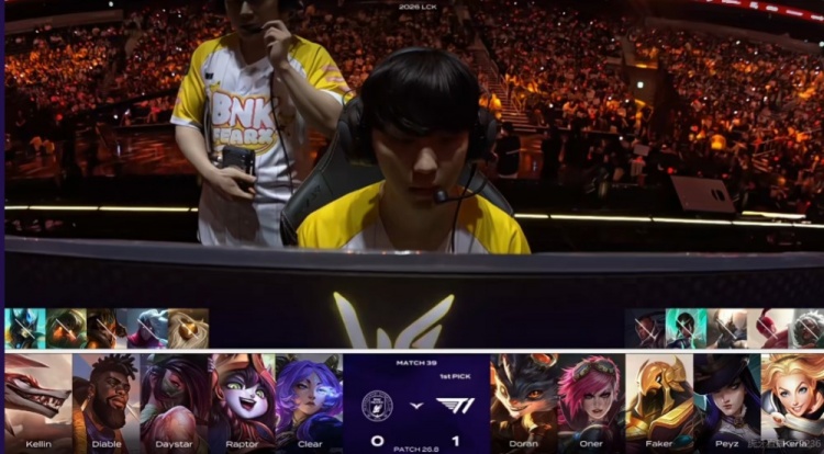 第一局:🎮Peyz烬爆杀Diable伊泽瑞尔 Keria主场战牛撞碎BFX T1赢首局
