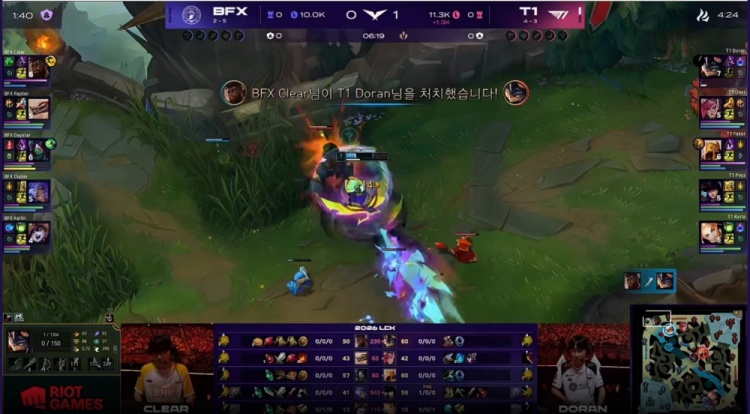 【6:19】上路上单solo,结果是Clear奎桑提贴脸完成对Doran兰博的对位单杀!Doran兰博还交了个离谱的后撤步闪现!