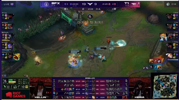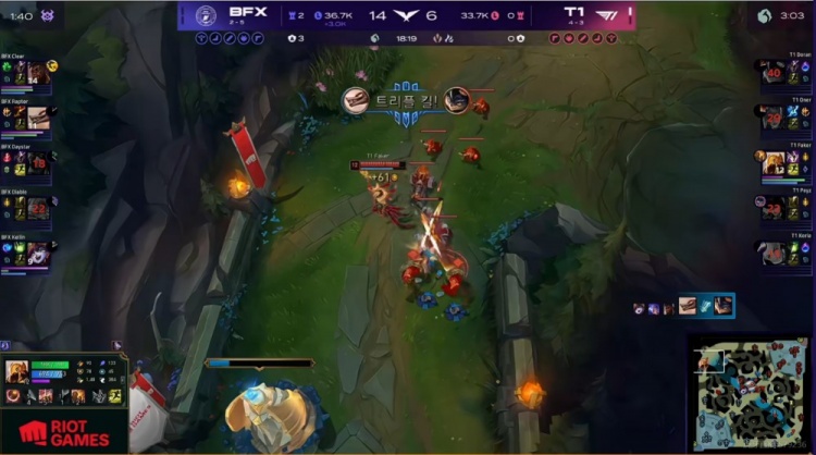 【14:10】上路Oner蔚锁头Daystar阿卡丽,但是BFX早早有支援蹲伏在身后啊!一波反打T1中野被留双双白给!回头Daystar阿卡丽拆掉上一塔,T1上野还想抓结果BFX野辅再度支援到位!T1中野连送两波!BFX随后拿下第三条小龙!经济反超2K多了!