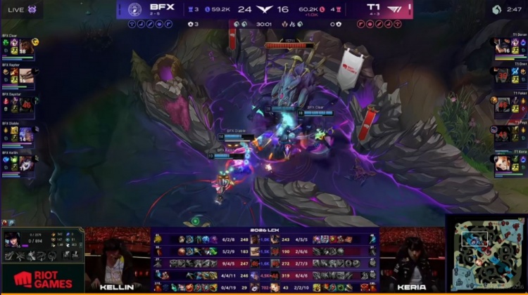 【20:31】BFX直接开大龙!Keria拉克丝没闪率先白给,不过Raptor纳亚菲利大招被断也送了!Oner蔚想反手锁头空中吃了变羊也没了!残局Clear奎桑提贴脸强行一换一,Faker沙皇推空,这波团最终是BFX打出3换5团灭T1!