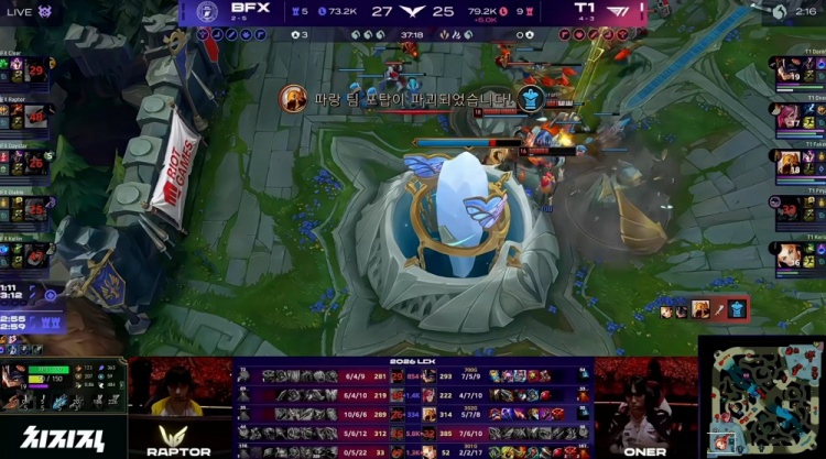 比赛进入中期,BFX中路团打出3换5团灭T1之后拿下大龙,但是追击过深结果又被T1下路组秀了,T1反手团灭对手之后撑住局势!随后BFX强冲击杀Peyz女警拿下二大龙,但是上路防守反打又被T1打出1换4!T1率先拆掉了BFX的中上两路高地!最终的团战BFX还想冲Peyz女警,但是照顾了太多技能和注意力在女警身上导致自己被T1逐个击破,T1打出1换4之后终于可以结束比赛,拿下主场背靠背的两连胜!