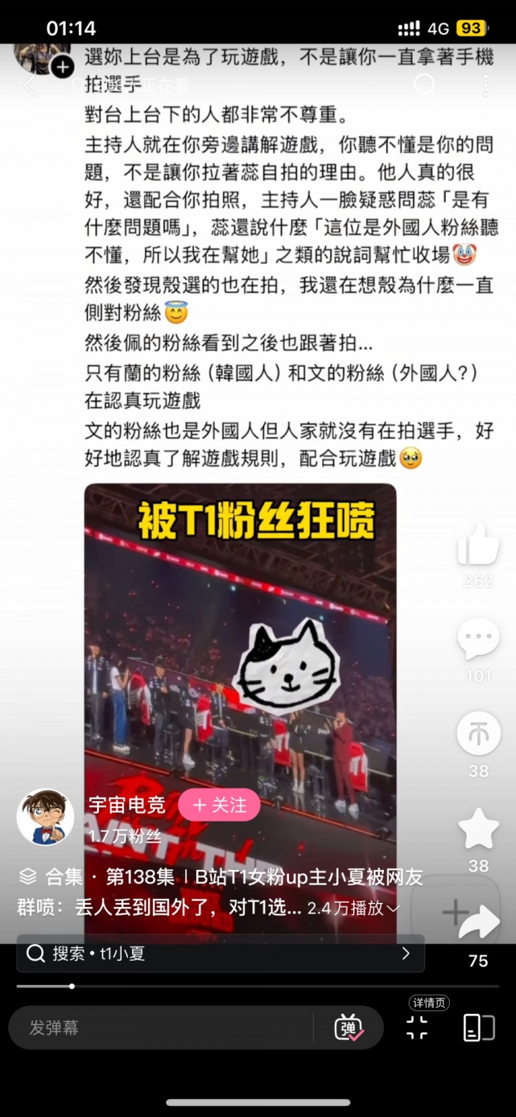 抖音博主“小夏”被现场抽中上台和T1选手进行互动游戏,但这一互动游戏的过程却遭到外网T1粉丝的口诛笔伐,外网T1粉丝称该博主在互动过程中全程举着手机拍摄选手,并且完全不理会现场主持人的交流,而当时的游戏环节也因为该博主完全无法进行。