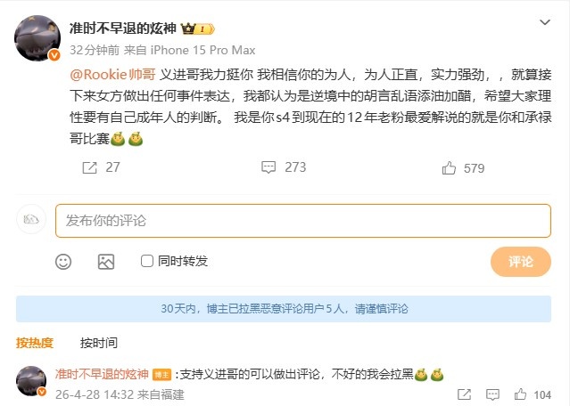 直播吧4月28日讯 今天Rookie女友更新动态,否认出轨并指控小钰一事引发圈内热议,知名主播炫神就此事表达了自己的看法,具体内容如下: