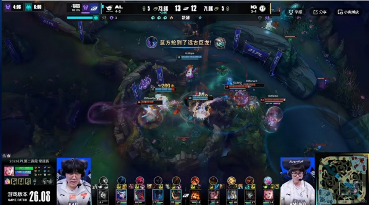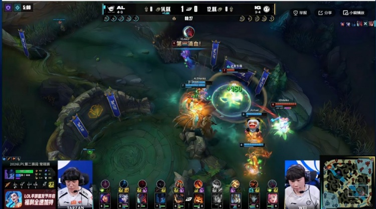 【8:27】小龙团,Hope艾希一箭命中,配合Tarzan梦魇关灯开飞+kael妮蔻闪现大直接秒掉了Wei赵信,这波AL打出1换2还抢到了第一条小龙,随后再拿三虫!领先快2K了!