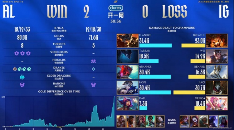 比赛进入中期,AL三人下路强杀Breathe纳尔,iG则是换掉了大龙!龙魂团Flandre兰博完美大招+前排掩护Hope艾希走A三杀,AL团灭iG拿下水龙魂,重新掌握比赛主动权!随后双方河道团1换1,但是上单换打野的AL拿下了二大龙!决胜的远古龙团Tarzan梦魇在4V5的局面下抢到远古龙,AL团灭iG结束比赛,自己收获三连胜的同时送给iG五连败!