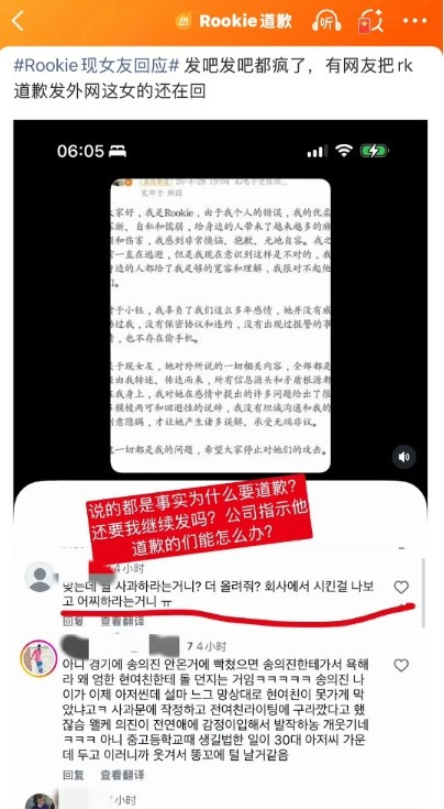Rookie本人于昨日发布了道歉动态,有网友将RK的动态搬给了外网的现女友,随后RK女友回复表示: