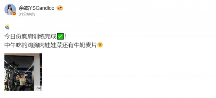 直播吧4月29日讯 今日,LPL女主持余霜更新微博分享自己的健身动态,并附文:今日份胸肩训练完成✅!中午吃的鸡胸肉娃娃菜还有牛奶麦片!