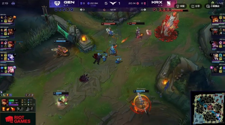 首局比赛7分钟Willer潘森跳大,帮助Rich纳尔击杀Kiin鳄鱼拿下一血!不过GEN则是Canyon皇子连续gank下路帮助自家下路组打出领先!12分钟KRX中路强开Chovy未果,Willer皇子被反杀,同时下路GEN线杀掉了对手辅助!这波0换2之后GEN上中合力再击杀Rich纳尔,经济领先来到3K!