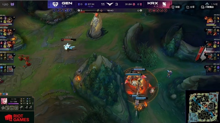 25分钟Chovy安妮中路被抓白给,Andil妮蔻坐大三个但是没伤害了啊!GEN反打一波1换3,高地团再秒KRX下路组之后结束首局比赛!