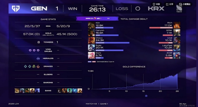 直播吧4月30日讯 LCK常规赛继续进行中,今天的首场比赛是GEN对阵KRX!