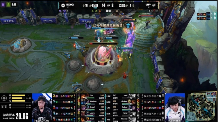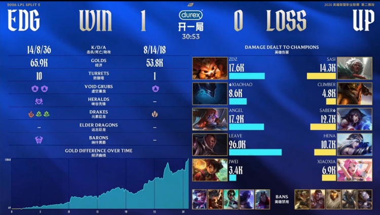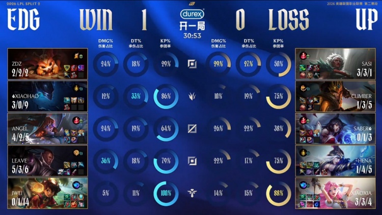 后期Sasi安蓓萨开大进场被Jwei米利欧大招解控,UP上野被杀,EDG轻松吃掉大龙,经济优势扩大到7k。后续EDG中路推进一波未果,UP终究无法阻挡EDG卷土重来,EDG赢下首局。