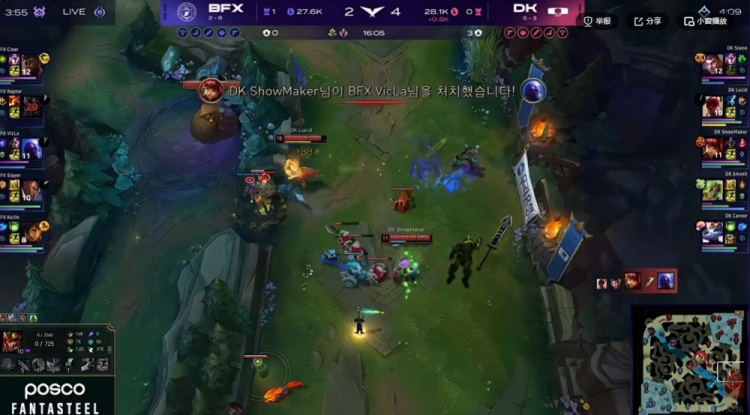 【19:55】SMK安妮蹲上配合杰斯逮捕了Clear奎桑提,BFX则是用先锋换掉了DK中一塔!随后小龙团Lucid盲僧又是串烧踢俩但是Kellin米利欧给大招帮助队友拉扯,双方打野一换一之后追击过深的Siwoo杰斯白给!BFX的1换2!随后的小龙团双方打野互秀,但是Lucid盲僧更胜一筹啊!抢到小龙的同时还帮助队伍打出1换4!这波团DK大胜,拉开4K经济差!