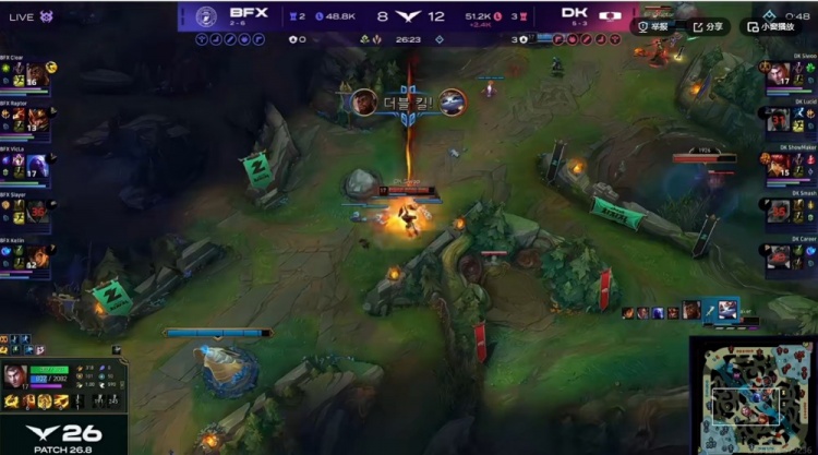 【26:10】中路团战第一波Lucid盲僧用命换掉了Slayer卢锡安!但是随后VicLa瑞兹+Clear奎桑提越中二塔强杀掉了DK下路组!这波BFX打出1换4啊!
