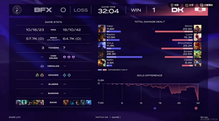 首局的比赛Lucid招牌盲僧节奏拉满+打团连续串烧一踢二!BFX则是二队AD的Slayer卢锡安面对Smash泽丽丝毫不落下风,还依靠VicLa瑞兹开车也不断gank边线!中期DK先拿4K经济但是被BFX打了回来!中期关键团战BFX打出1换4但是犹犹豫豫没能拿到大龙啊!31分钟中路团两边AD手长差距,Slayer卢锡安有点急了直接被打残,BFX想撤被DK逐个击破,最终DK打出4+1的团灭局,直接一波结束掉了首局比赛!