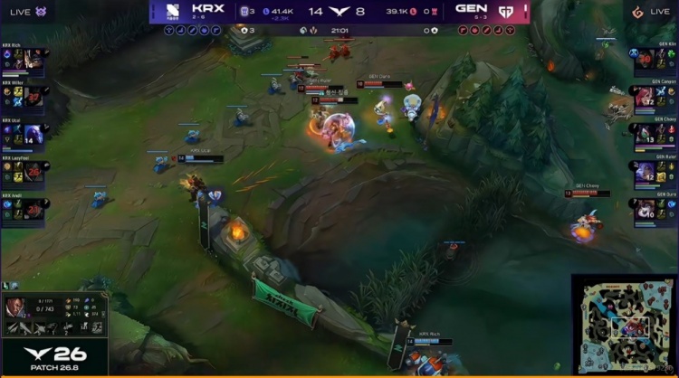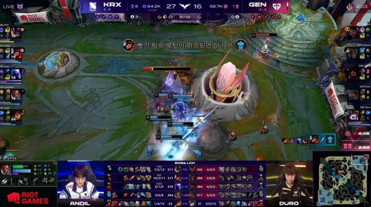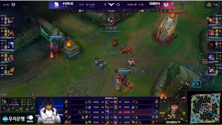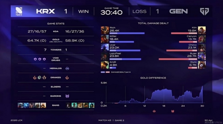 第一局:🎮等级森严!KRX迷路白给团战一碰就碎 23分钟GEN轻松赢首局