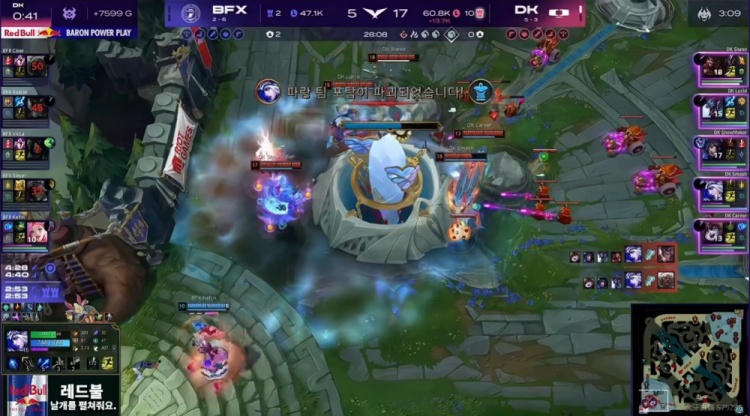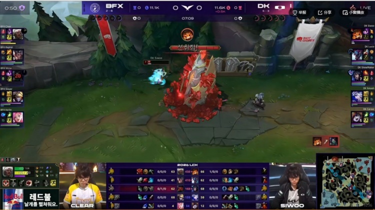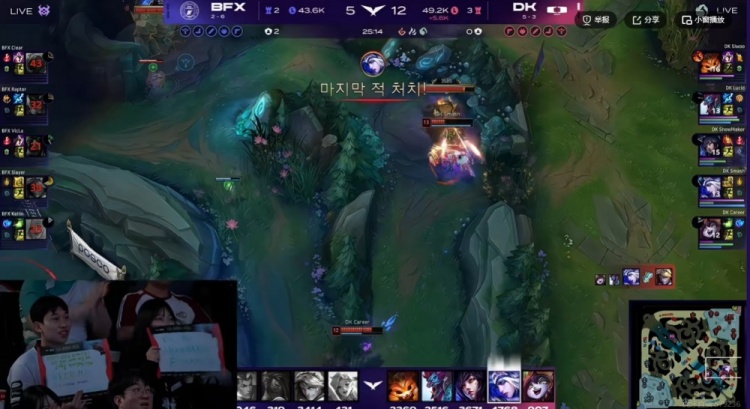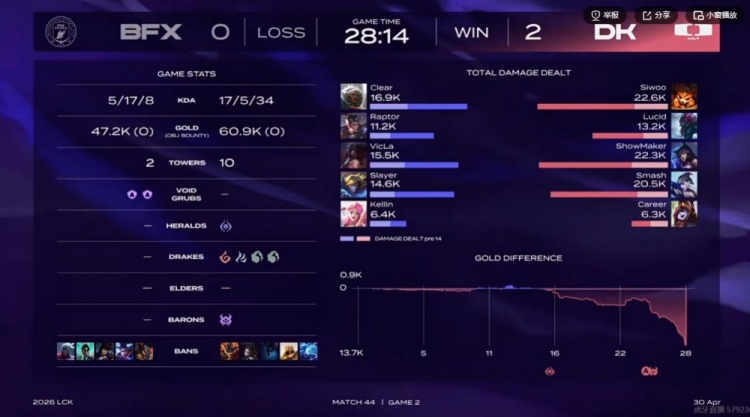 第二局比赛开局VicLa阿卡丽包上结果送给Siwoo纳尔单杀一血,DK几乎全线优势,中期DK运营压制+SMK阿狸几波团战配合Smash艾希大招连续找到对手C位,关键的龙魂团VicLa阿卡丽直接吃到艾希大+阿狸魅惑瞬间没了!DK追击轻松团灭BFX,拿下水龙魂+大龙胜局已定了!最终Siwoo纳尔上路配合队友击杀BFX中辅,DK从中路一波结束比赛,轻松横扫击败BFX!
