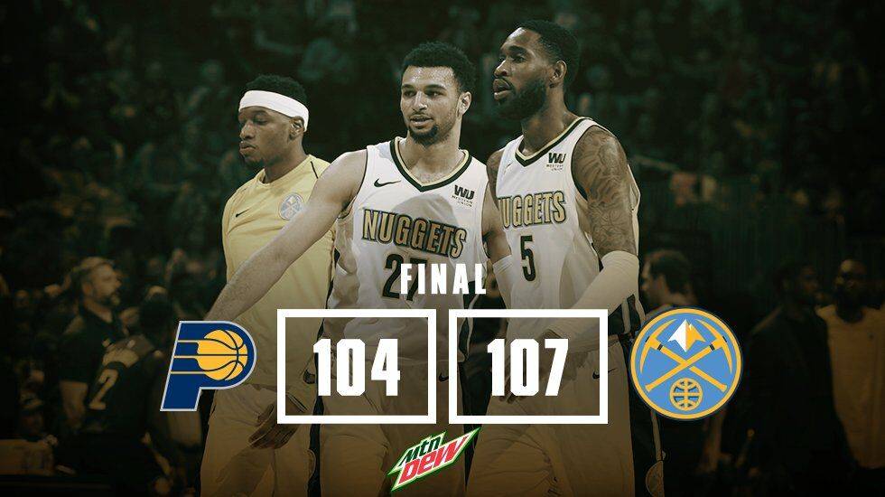 直播吧4月4日讯 2017-18赛季NBA继续进行,丹佛掘金主场迎战印第安纳步行者。步行者已经取得五连胜,掘金目前取得两连胜。上半场,两队打得难解难分,掘金取得微弱领先。下半场,两队轮番打出进攻高潮,掘金一直维持领先。最终,掘金107:104战胜步行者,取得3连胜的同时终结了对手的5连胜。