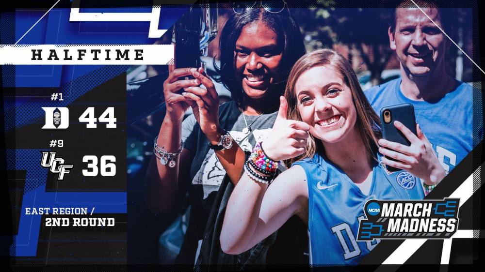 下半场易边再战,中佛罗里达大学一开始就打出一波7-2迫近比分,杜克迅速暂停进行调整,调整完打出5-0回应。但是佛罗里达大学展现出了自己的韧性,法尔坐镇篮下多次防住了杜克球员的冲击,杜克空位特雷-琼斯在中远距离连续三次尝试未能命中,佛罗里达大学一点点缩小分差。佛罗里达大学后卫BJ-泰勒在命中三分后成功反超,但锡安随即回敬三分打平。双方再次进行暂停调整,回来后特雷-琼斯顶住压力命中一记空位三分,随后古德维尔反击再度命中三分,杜克稍稍拉开分差至7分。中佛罗里达大学此后依靠外线火力持续追分,在道金斯、泰勒等人连续命中三分后,中佛罗里达大学以70-68反超。杜克调整后由锡安单打打平,道金斯中距离再度领先,随后防守端造了锡安的进攻犯规。