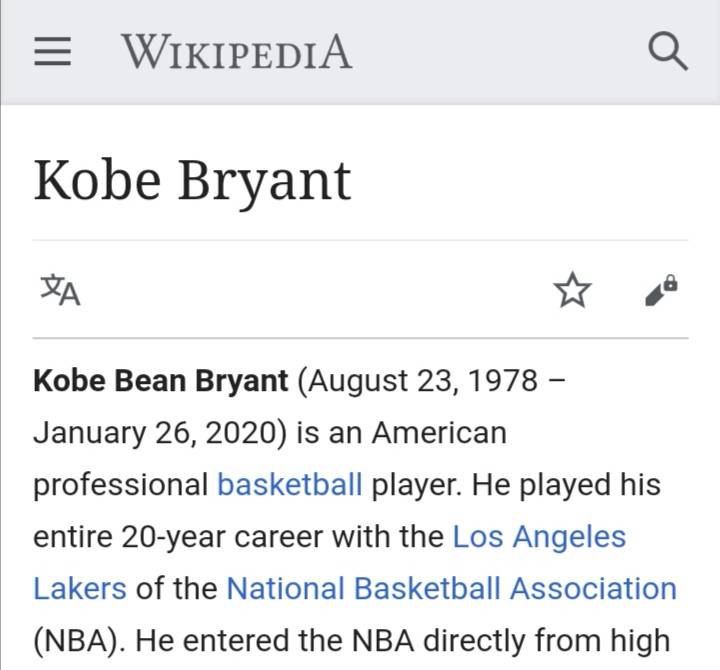 直播吧1月27日讯 科比最新的维基百科简介的生卒年已被改为: 1978.8.23 - 2020.1.26。