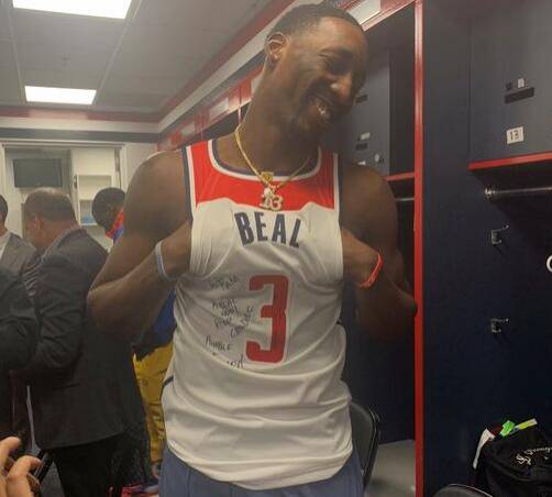 直播吧3月9日讯 今日热火100-89战胜奇才。赛后阿德巴约和比尔交换了球衣,比尔在上面签了名。阿德巴约直接穿着比尔的球衣在更衣室接受了采访,不过显然衣服有点小,显得很紧绷,自己也很不好意思。