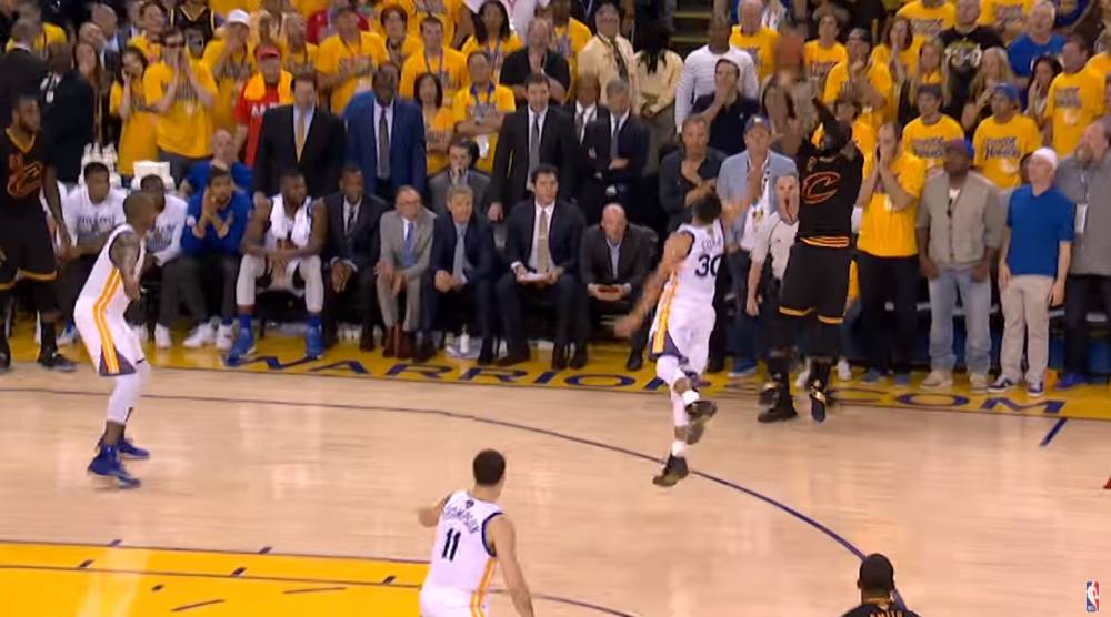 2016年6月20日,NBA总决赛G7,骑士做客甲骨文球馆对阵勇士。终场前1分钟左右,两队战成89-89!骑士的进攻回合,欧文在左侧外线单打库里,只见他连续胯下运球之后,往右撤步来了一记三分球,皮球应声入网,92-89!