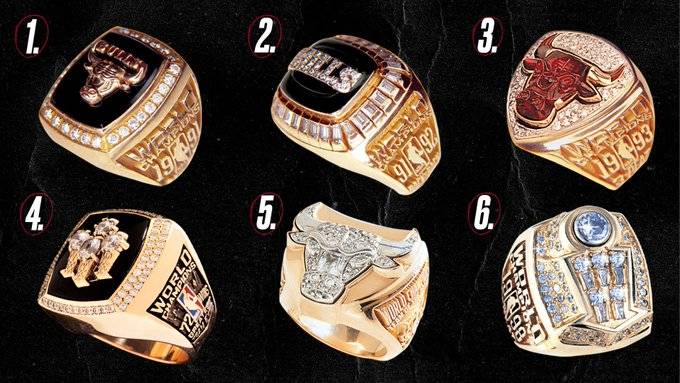 直播吧4月19日讯 公牛官方今日更新了社媒,晒出队史6枚总冠军戒指的展示图。