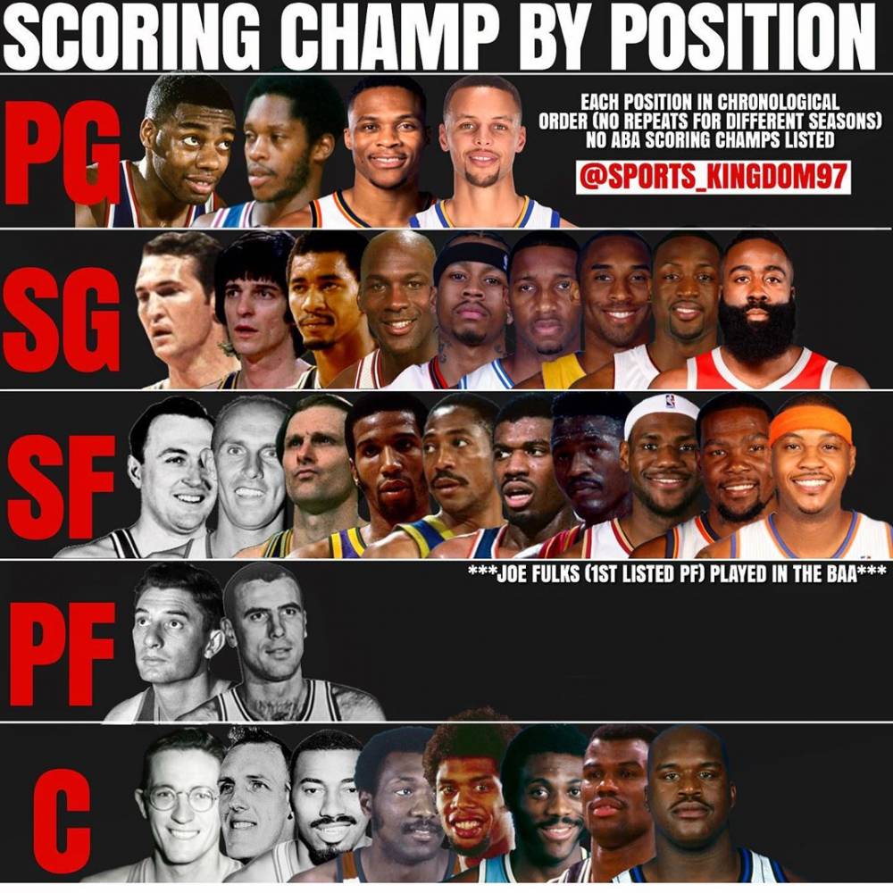 直播吧4月29日讯 昨日有美媒总结了NBA历史上各个位置上的得分王一览。在球场上五个位置中,大前锋位置得分王最难产,历史上仅有2位球星。NBA历史上常规赛一共有33位得分王,大部分得分王都是出自分卫&小前锋位置。