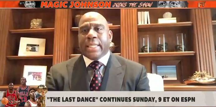 直播吧5月5日讯 魔术师做客节目时,谈到了90年代的公牛队。
