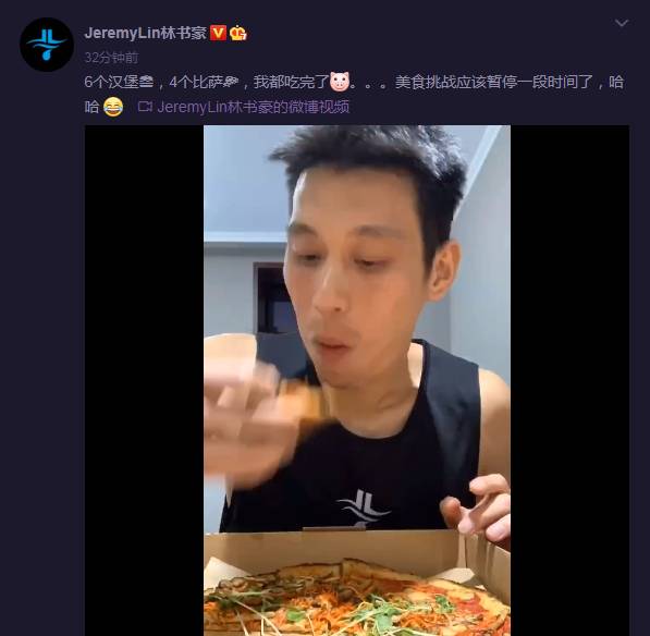 直播吧6月3日讯 林书豪更新微博,晒出一段自己吃披萨的视频。