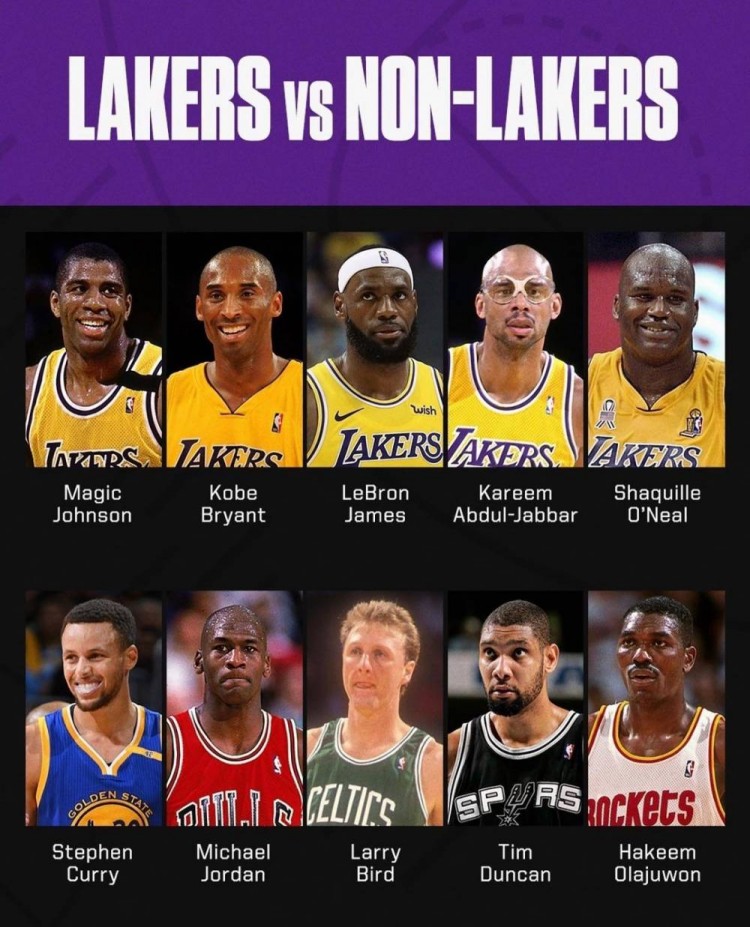 直播吧12月5日讯 偏爱“关公战秦琼”的NBA名宿奥尼尔,今日再次在个人社交媒体晒出一张图片,并和网友讨论湖人历史最佳阵容(魔术师、科比、詹姆斯、贾巴尔、奥尼尔)和非湖人历史最佳阵容(库里、乔丹、伯德、邓肯、奥拉朱旺)谁更强。
