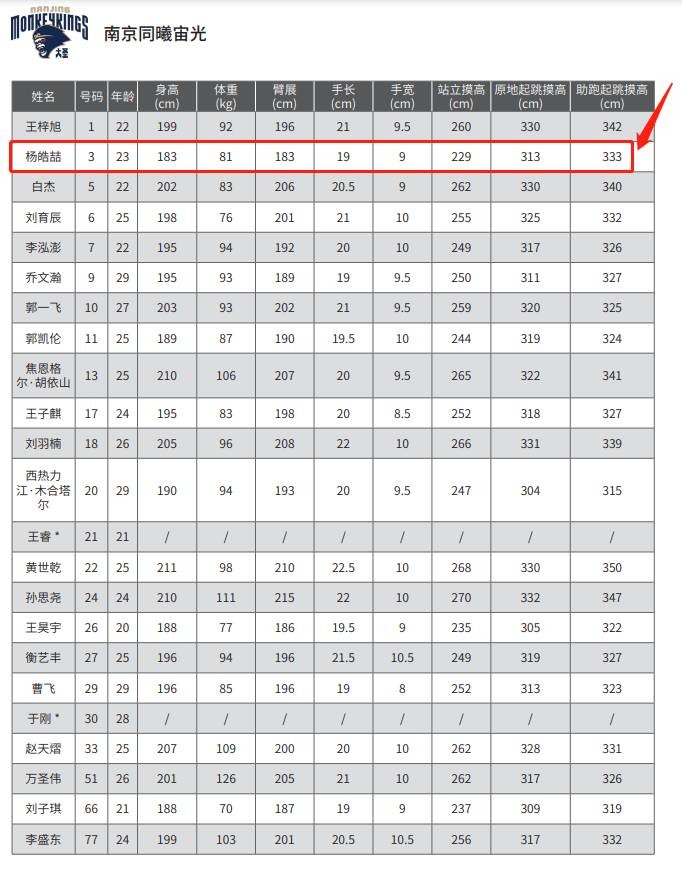 值得一提的是,南京同曦宙光球员杨皓喆的助跑摸高达到3米33(篮筐高度3米05),是联盟中极少数弹跳高度达到1米以上的球员。