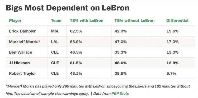 詹姆斯和伊尔戈斯卡斯还有瓦莱乔的三人配合也非常纯熟,挡拆之后,伊尔戈斯卡斯有时会到侧翼等待接球,鉴于詹姆斯强大的威慑力,瓦莱乔经常会得到许多溜底线上篮的机会,他也能准确地把握住这些机会将球送进篮筐。在詹姆斯身边打球是非常舒服的,只要你愿意跑动、挡拆并把握好攻击篮筐的时机,詹姆斯就能让你成为一个高效的得分手。瓦莱乔的终结能力不算出色,但他在骑士还是有许多的打球机会;古登作为一名内线进攻不错的球员,在骑士打出了职业生涯最高的得分效率;希克森在和詹姆斯搭档时的真实命中率达到了61.8%,这与上赛季夺得最佳第六人奖的哈雷尔处于同一水准,但当詹姆斯不在的时候,希克森的真实命中率便暴跌至48.6%。